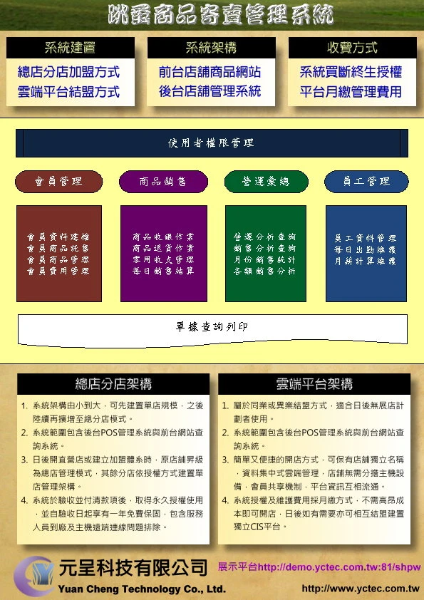 元呈科技寄賣POS管理系統提供跳蚤店家所需的營業管理系統及會員網站查詢系統完善的解決方案,包含系統管理、基本設定、會員管理、商品銷售、單據查詢、內部管理、管理報表等店家最主要的需求。本系統並有支援展店功能,日後店家開拓第二家以上分店或建立加盟體系時本系統亦能滿足需求。
